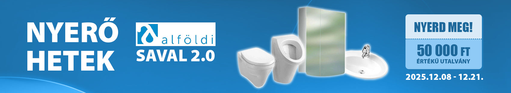 Vásárolj december 8. és december 21. között a kijelölt Alföldi Saval 2.0 szaniterek közül webshopunkban vagy áruházaink valamelyikében, töltsd fel a vásárlást igazoló számla sorszámát, és nyerj!